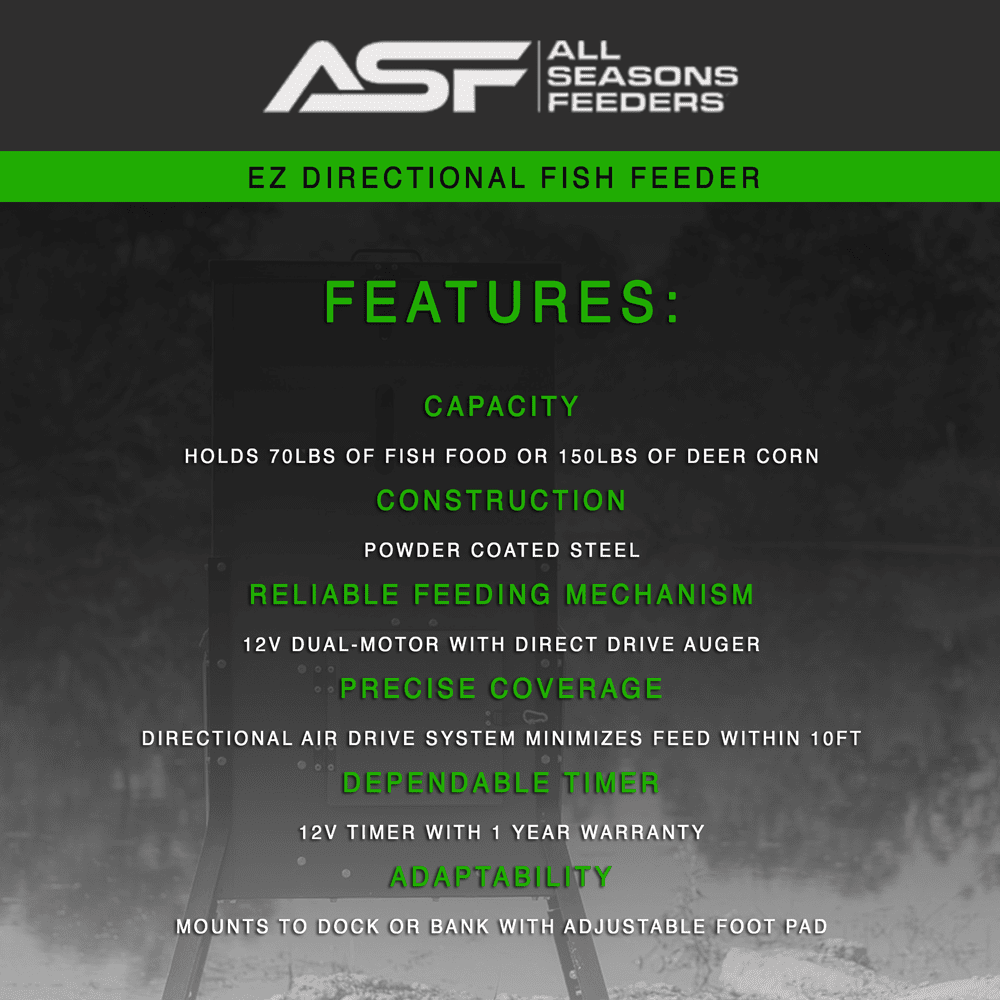 • Holds 70lbs of fish food and 150lbs of deer corn